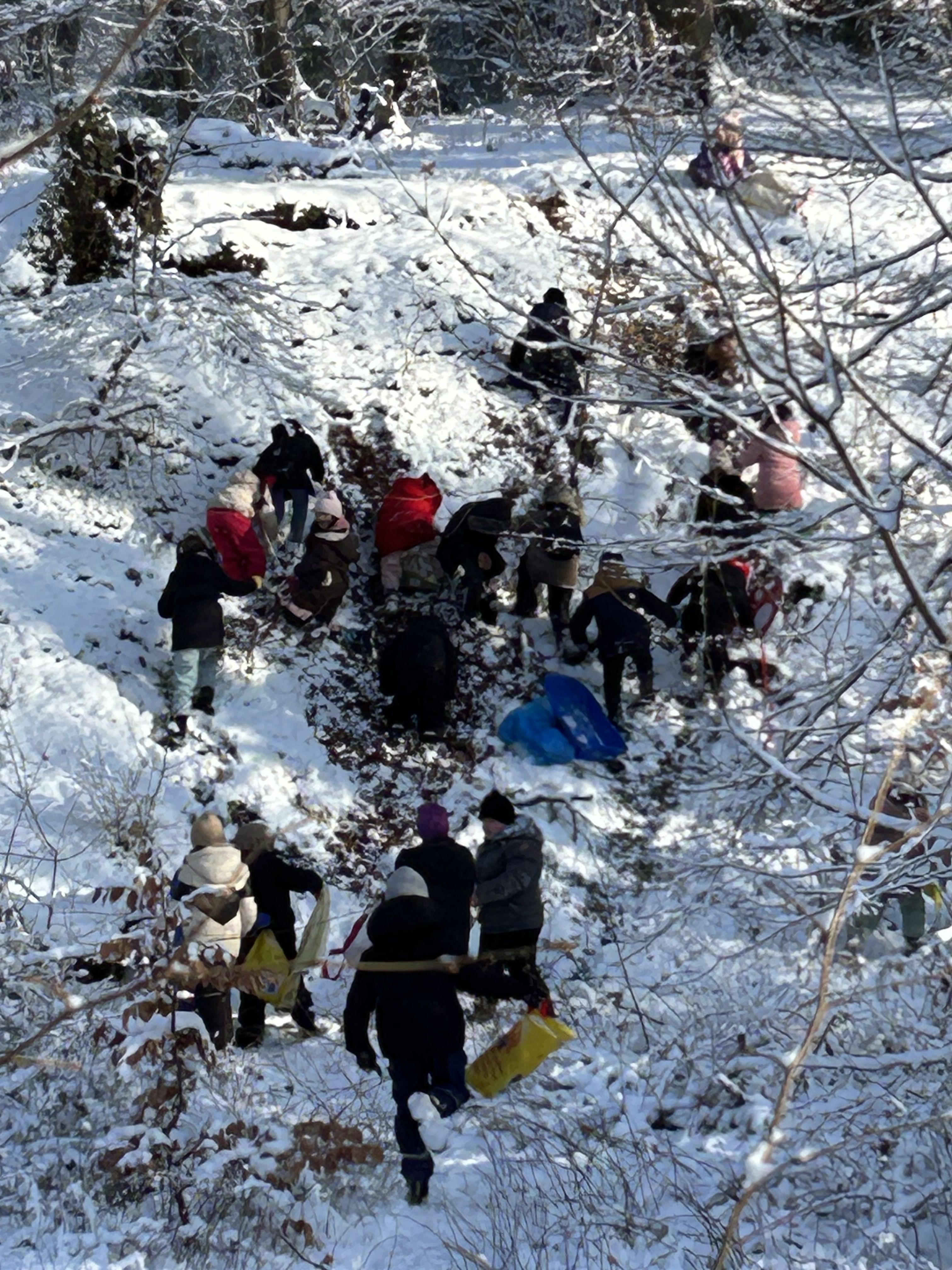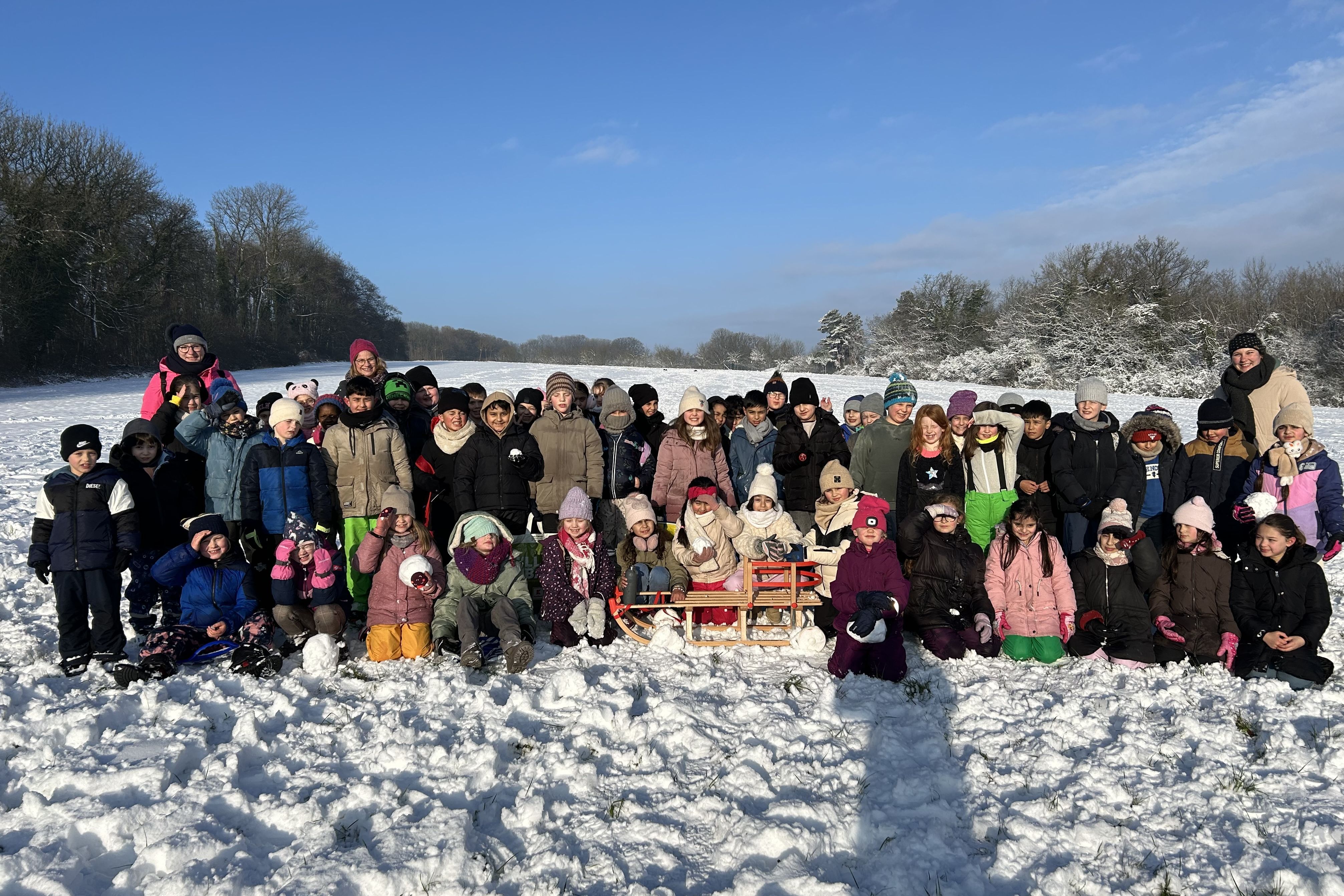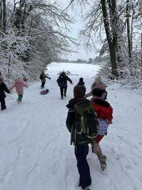 Anhaltender Schneefall und kalte Temperaturen - die Wetterlage ist seit Tagen wunderbar winterlich. Und so entschieden sich die 2. Klassen für eine Winterwanderung durch den Wald zur großen Wiese am Herrmannsweg. Dort konnten die Kinder nach Herzenslust toben, durch den Tiefschnee stapfen, Schneekugeln formen oder sich auf dem Schlitten ziehen lassen. Anschließend ging's wieder Richtung Schule, nicht ohne die kleinen Hänge im Wald runterzurutschen und wieder raufzuklettern. Am Ende hatten die Kinder eine ganz schöne Strecke gelaufen, aber auch jede Menge Spaß und alle waren sich einig: Dieser Winter ist einfach klasse!